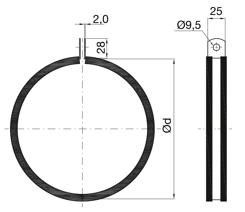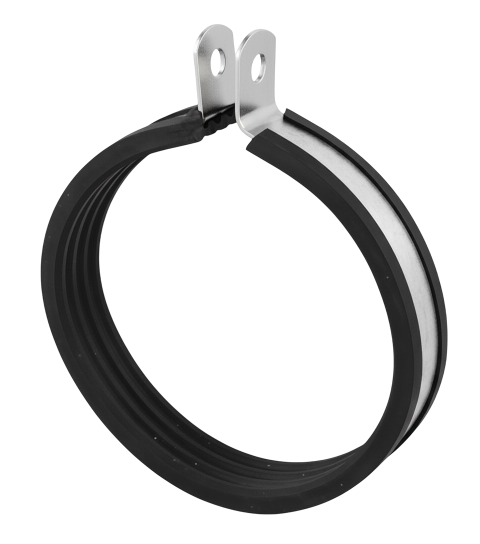 Description Clamp with short ear, with vibration-damping internal rubber lining, for suspension of circular ducting in restricted spaces. For insulated duct it is recommended that the suspension ring is mounted inside the insulation.