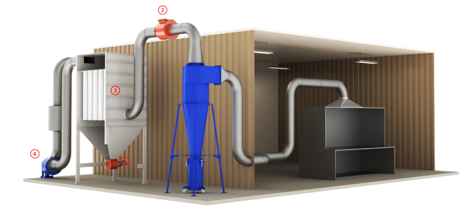 1 – Van xoay RVA-X; 2 – Van cách ly chống nổ ATEX; 3 – Bộ lọc bụi ATEX; 4 – Quạt hút ATEX