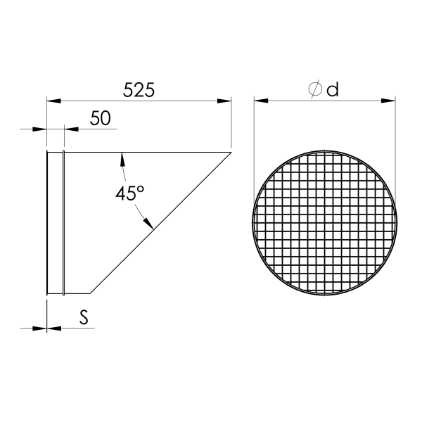 Chụp thông hơi vách tiêu chuẩn được hàn lăn và tích hợp lưới chắn chim. Được thiết kế để lắp đặt nằm ngang. Các hướng lắp đặt khác có thể thực hiện được bằng cách dùng cút.