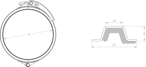 Đai khóa có lót PVC đen tích hợp kèm tay gạt và bản lề, dùng cho ống lồng (AAAS). Từ Ø 80 đến Ø 400 mm có tích hợp bản lề và tay gạt. Từ Ø 450 mm, đai được cung cấp không có bản lề và đi kèm bu lông M8x80. Dùng để lắp ráp đường ống từ 0.75 mm đến 1.25 mm. Momen xoắn siết chặt tối đa từ Ø450 trở lên: 10 Nm.