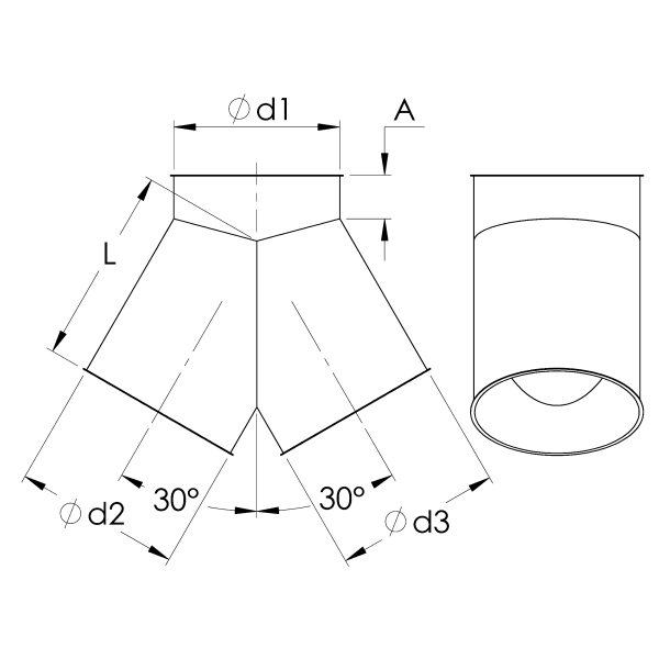 Nhánh chữ Y hình trụ hàn kín hoàn toàn ở góc 2 x 30º với ba đường kính bằng nhau hoặc hình côn với hai đường kính khác nhau. Các nhánh chữ Y này thích hợp để vận chuyển vật liệu thải như bụi và dăm bào, cũng như vận chuyển ngũ cốc và các loại tương tự.