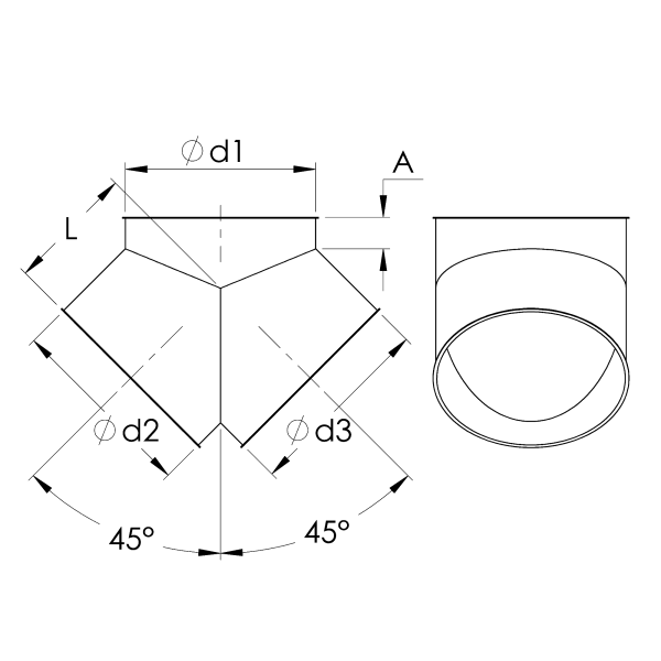 Nhánh chữ Y hình trụ hàn kín hoàn toàn ở góc 2 x 45º với ba đường kính bằng nhau. Các nhánh chữ Y này thích hợp để vận chuyển vật liệu thải như bụi và dăm bào, cũng như vận chuyển ngũ cốc và các loại tương tự.